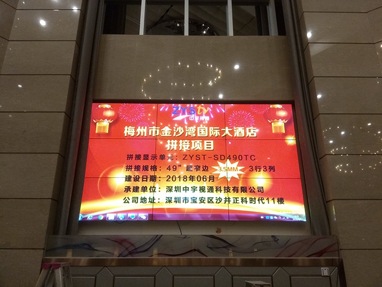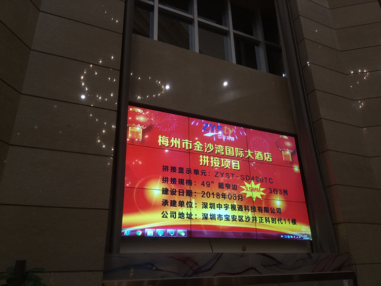 梅州市金沙灣國(guó)際大酒店選用中宇視通科技49寸3.5mm拼縫液晶拼接屏,項(xiàng)目安裝調(diào)試完成并且順利通過驗(yàn)收。