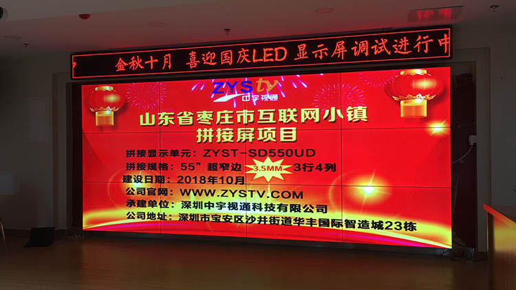 山東棗莊市互聯(lián)網(wǎng)小鎮(zhèn)55寸超窄邊3.5mm3行4列液晶拼接屏項(xiàng)目,安裝調(diào)試完成并且順利驗(yàn)收,中宇視通科技全體職工從深圳發(fā)來賀電!