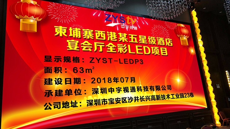 柬埔寨西港某五星級(jí)酒店與中宇視通科技合作,宴會(huì)廳63平方P3全彩LED顯示屏項(xiàng)目安裝完成,整屏點(diǎn)亮并驗(yàn)收完成。