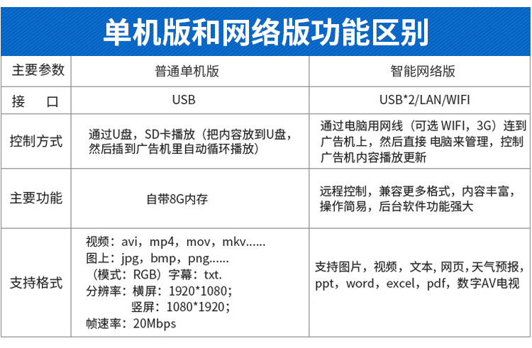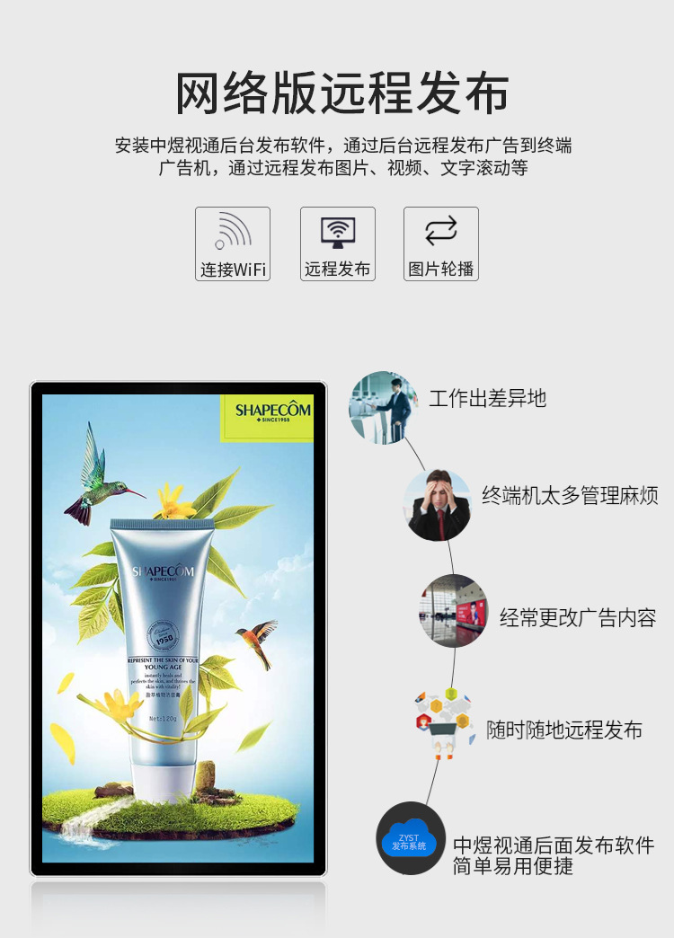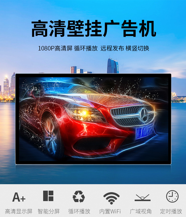 43寸壁掛廣告機采用專業(yè)級工業(yè)液晶屏,視頻圖像展現(xiàn)清晰、自然,能夠更好的表現(xiàn)廣告細節(jié);機身設(shè)計外觀時尚、大方,超薄,使用方便、美觀,采用全新環(huán)保技術(shù),穩(wěn)定性好,能夠適應(yīng)并在惡劣環(huán)境中正常工作。正常使用情況下,可達60000小時以上的超長的使用壽命,并且能夠7*24小時不間斷工作。目前,液晶廣告機憑借優(yōu)良的顯示性能,已經(jīng)成為人們認同的理想的“第五大媒體”顯示設(shè)備。